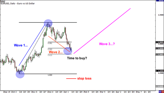 你发现,汇价刚好处于50%的斐波那契回撤位水平,嗯,这很可能就是第3浪的开启阶段,因为它已经发出了非常强的买入信号。作为精明交易者的你,止损点的设置也当然在你的考虑之内。