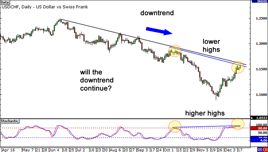 如图所示,美元/瑞郎一直处于下降趋势中。注意看,汇价时如何形成一个更低的高点,但是随机指标却持续创出新高的。
